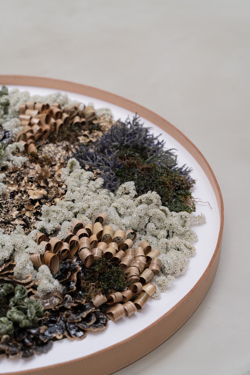 「カワラダケ」を中心に構成し、そのネイビーの色を活かしつつ、ホテルの洗練されたデザインに合わせて色彩を構成しました。植物は1点1点丁寧にレジンでコーティングしています。ヌメ革で額を作ったのも今回初の試みです。