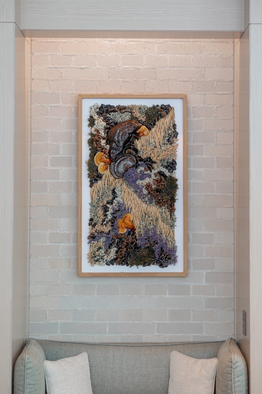 前回の作品に引き続き「カワラダケ」を中心に構成し、新たに取り入れたきのこ類の「サルノコシカケ」、さらに葉焼けで色味が飛んでしまった「ソテツ」の葉を用い、ホテルとの相性を意識しながらも、前回とは異なる雰囲気に仕上げました。